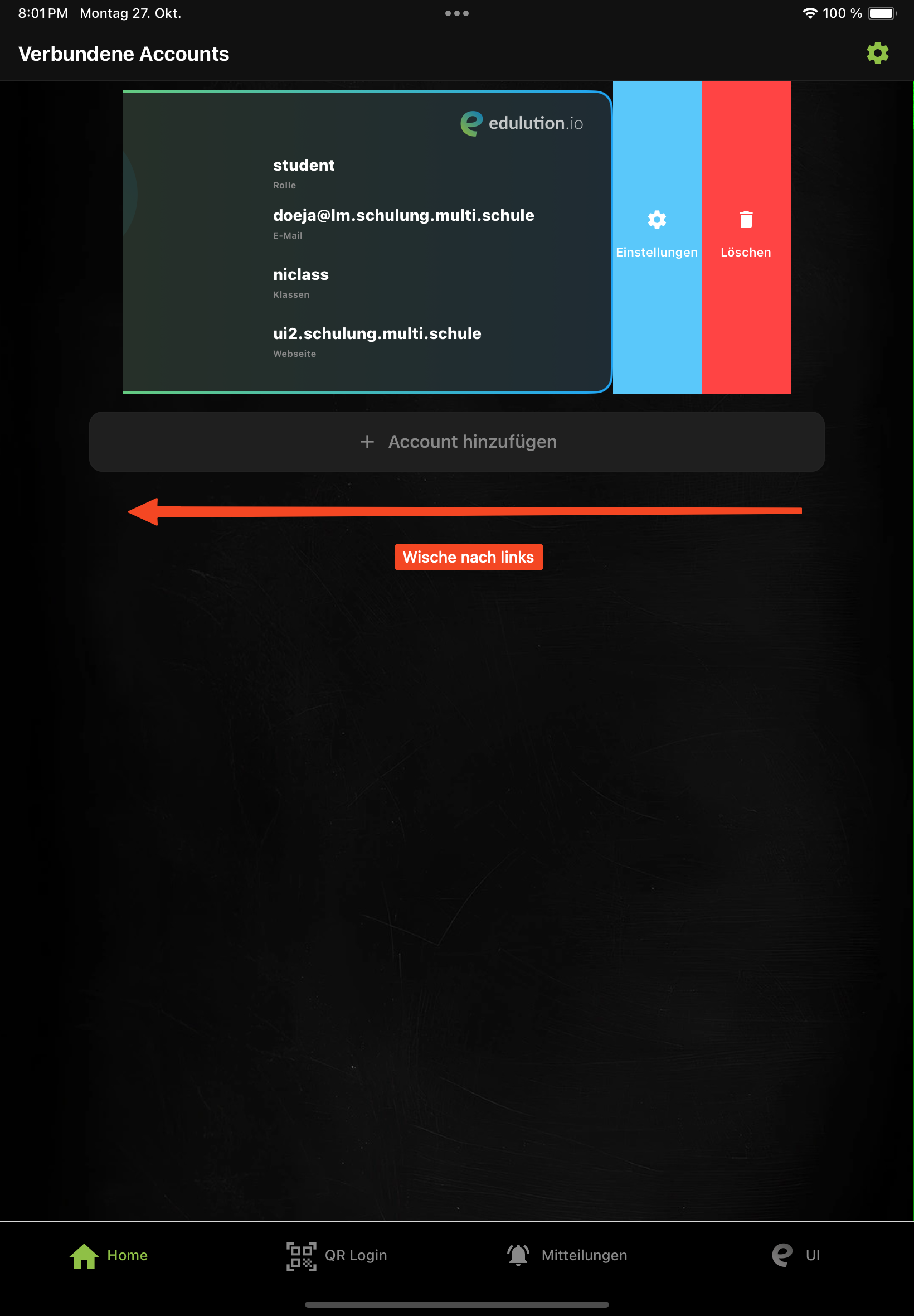 Um auf die Einstellungen eines Accounts zuzugreifen, wische die Account-Karte nach links und tippe auf das Einstellungen-Symbol.